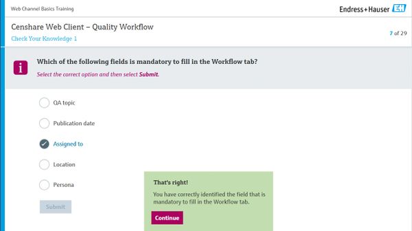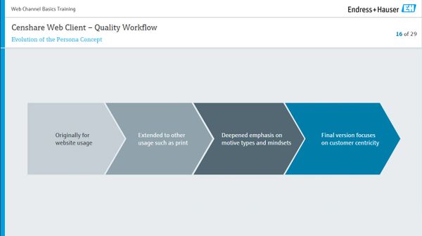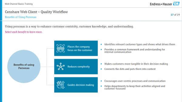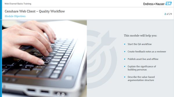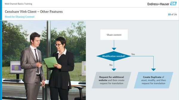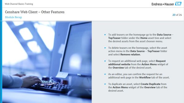 Endress+Hauser recently switched to a new web client called Censhare to enable flexible access to the Content Management System. The global and local website content creators along with the quality check approvers needed a thorough understanding of the new interface to operate the Censhare Content Management System effectively. A self-paced web-based training was proposed as a pre-requisite to the virtual Web Channel Editor classroom training so that learners could benefit from the hands-on training consisting of roleplay and best practices exchange.